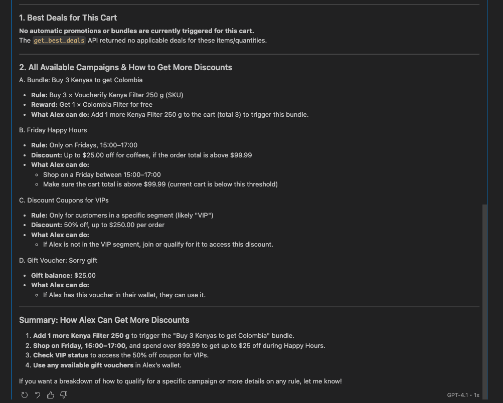 You can interact with the Voucherify MCP using natural language in your AI agents, just as you would with other AI tools.Get best deals for a given customer